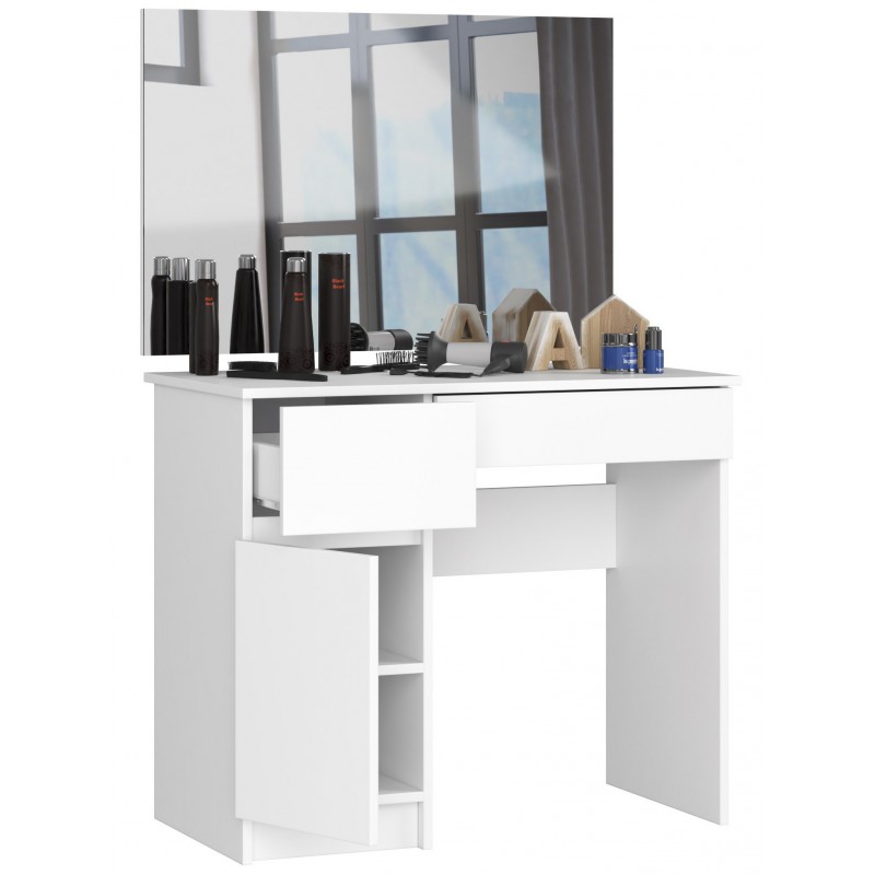 Masa de toaleta/machiaj, 2 sertare, 2 rafturi, stanga, cu oglinda, alba, 90x50x77/142 cm