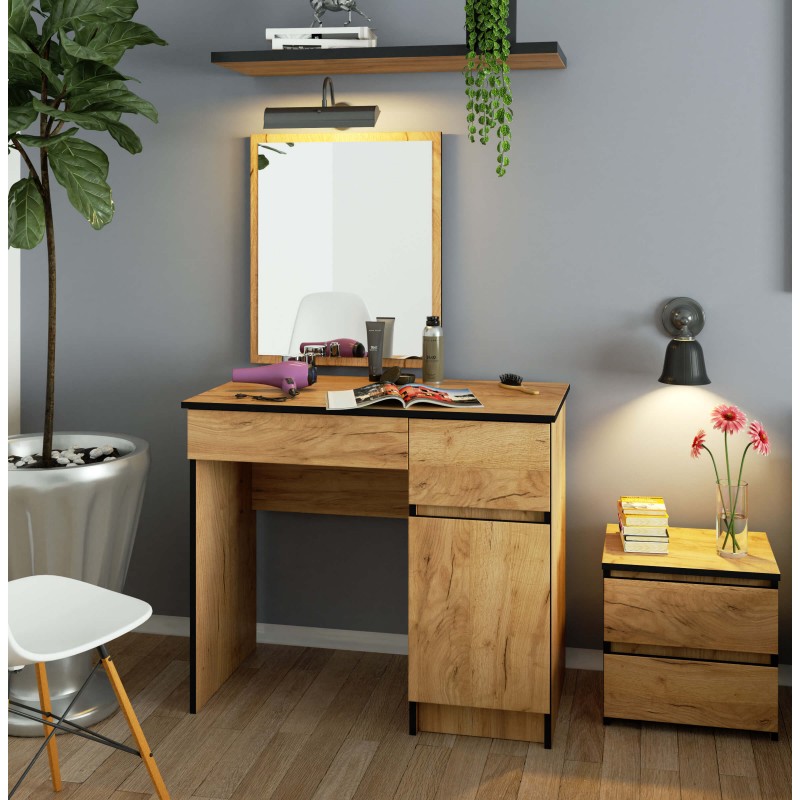 Masa de toaleta/machiaj, 2 sertare, dreapta, cu oglinda, dulap, stejar craft, 90x50x77/142 cm