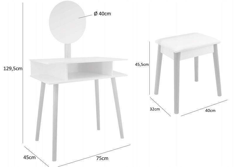 Masa de toaleta, machiaj, alba, cu oglinda rotunda, taburet, 75x45x130 cm