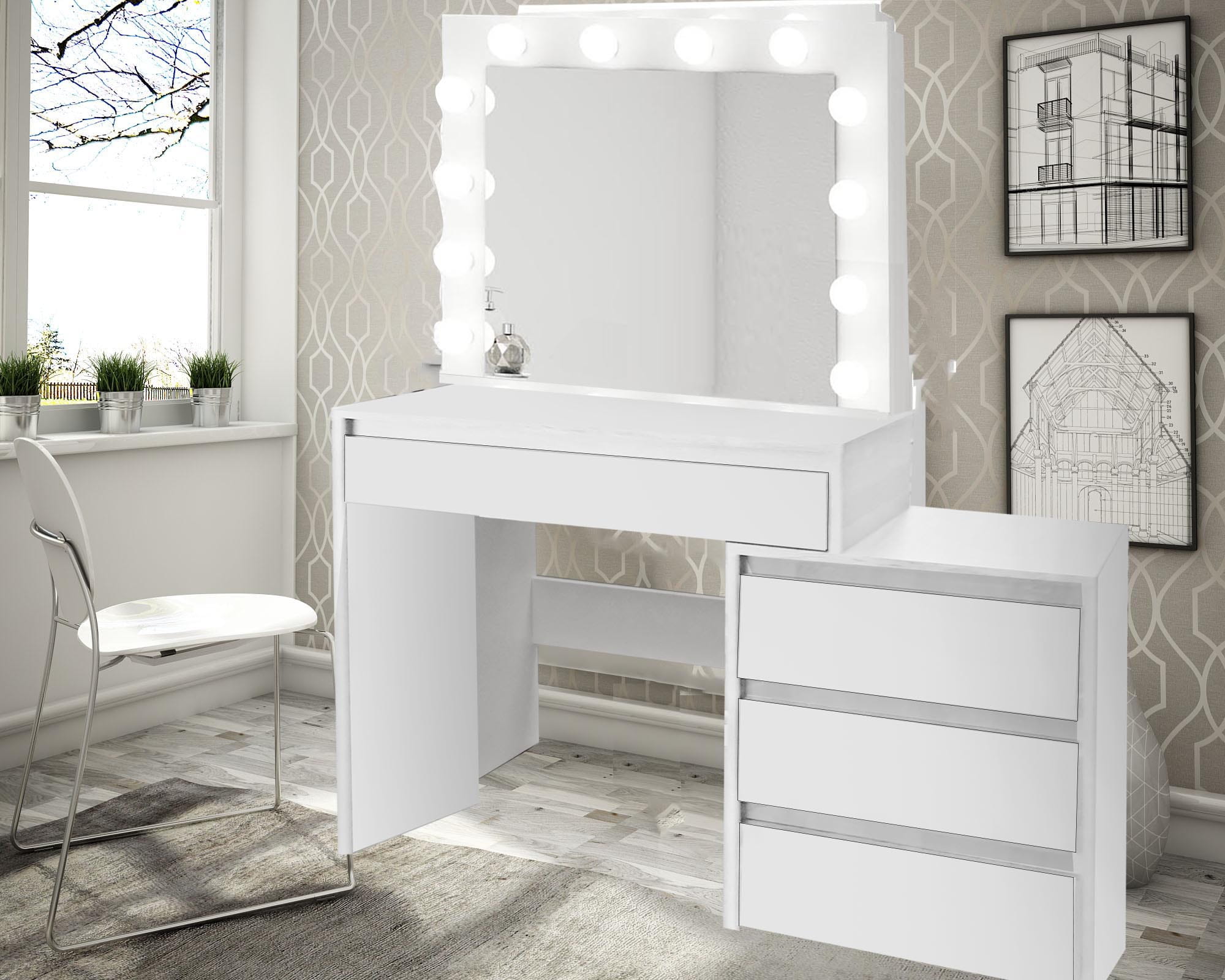 Masa de toaleta alba pentru machiaj cu oglinda si 12 leduri este cu siguranta visul oricarei femei.