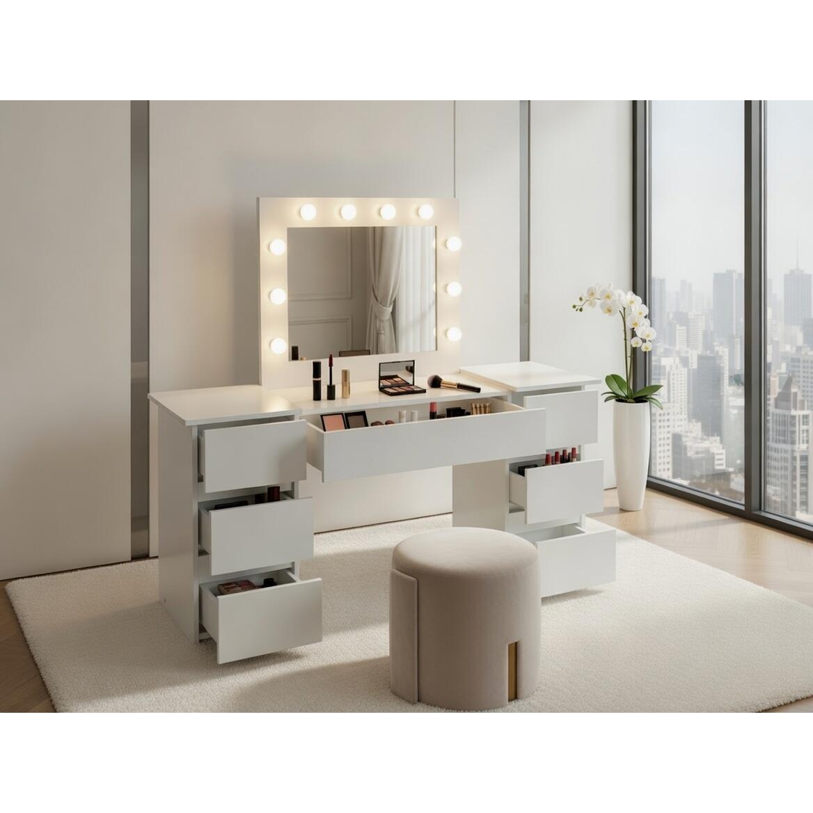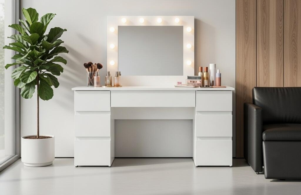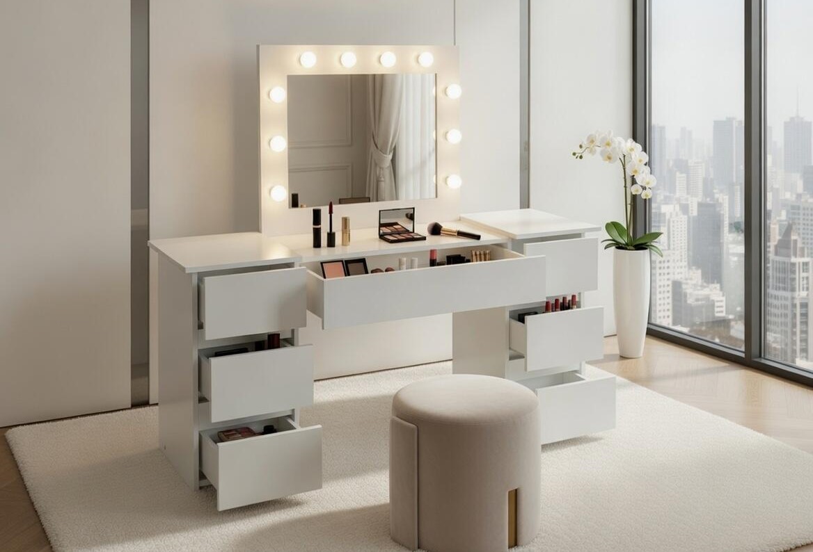 - Este o piesa de mobilier eleganta si practica, proiectata pentru a satisface nevoile si preferintele persoanelor care cauta un spatiu dedicat pentru a-si ingriji frumusetea si a-si stoca cosmeticele si bijuteriile. Aceasta masa este prevazuta cu o oglinda mare si 10 lumini LED incorporate, ceea ce o face ideala pentru aplicarea machiajului sau coafurii.