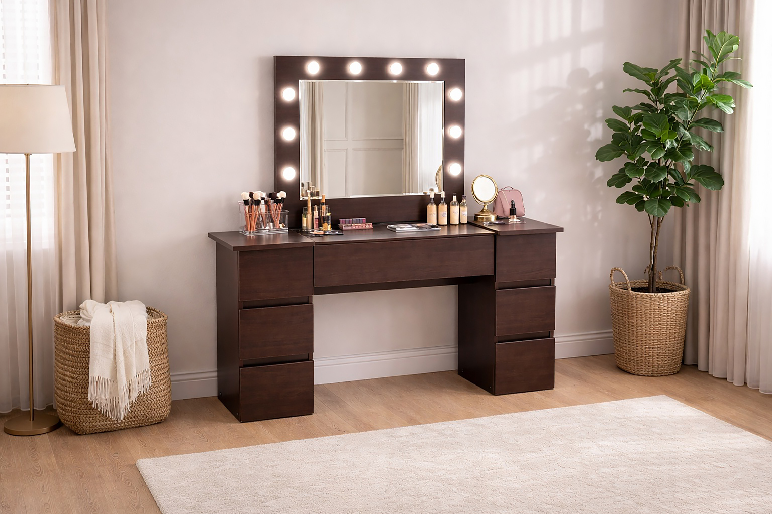 - Este o piesa de mobilier eleganta si practica, proiectata pentru a satisface nevoile si preferintele persoanelor care cauta un spatiu dedicat pentru a-si ingriji frumusetea si a-si stoca cosmeticele si bijuteriile. Aceasta masa este prevazuta cu o oglinda mare si 10 lumini LED incorporate, ceea ce o face ideala pentru aplicarea machiajului sau coafurii.