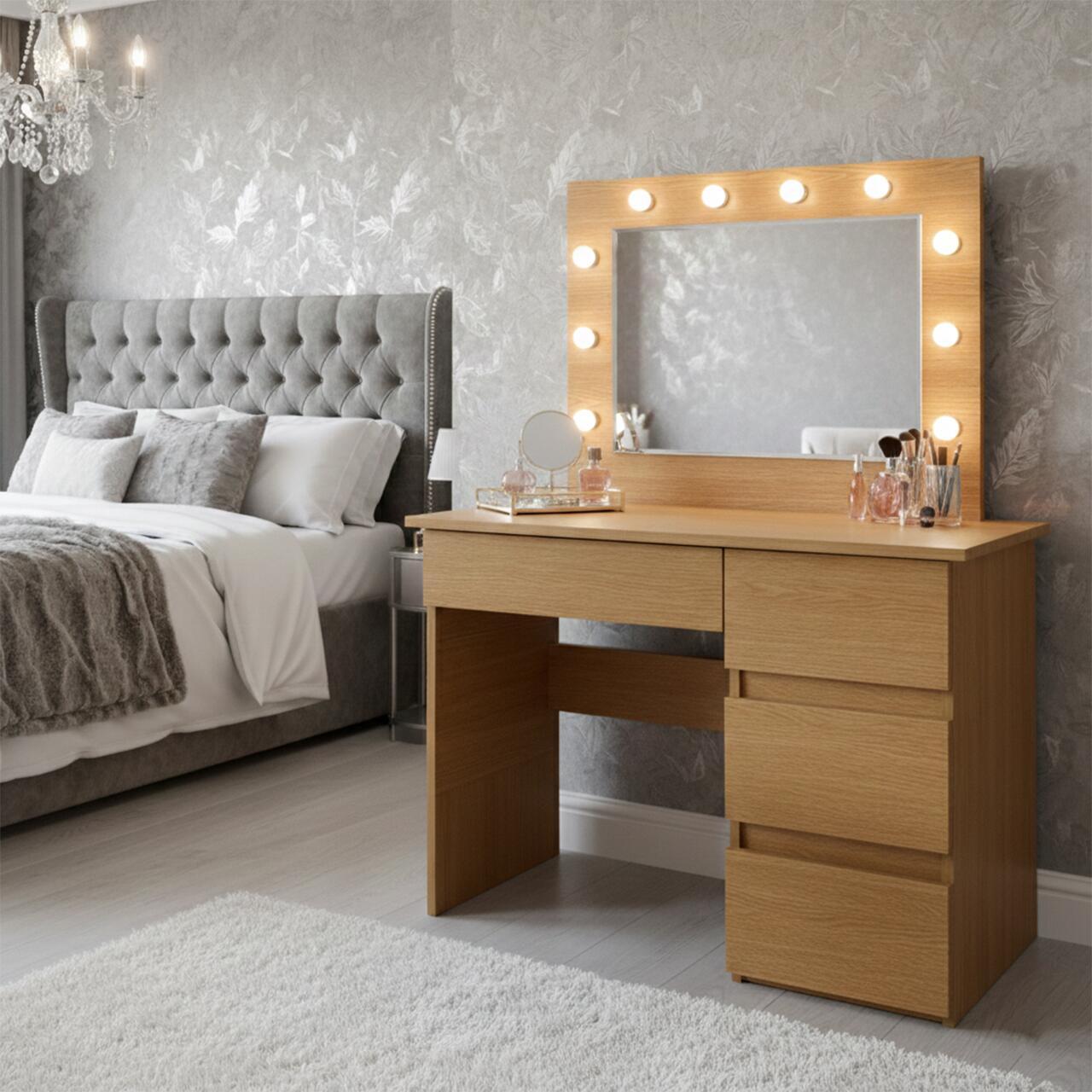 Masa de toaleta/machiaj, Irina, stejar + scaun Noto, negru, cu oglinda si LED-uri, 94x43x141 cm