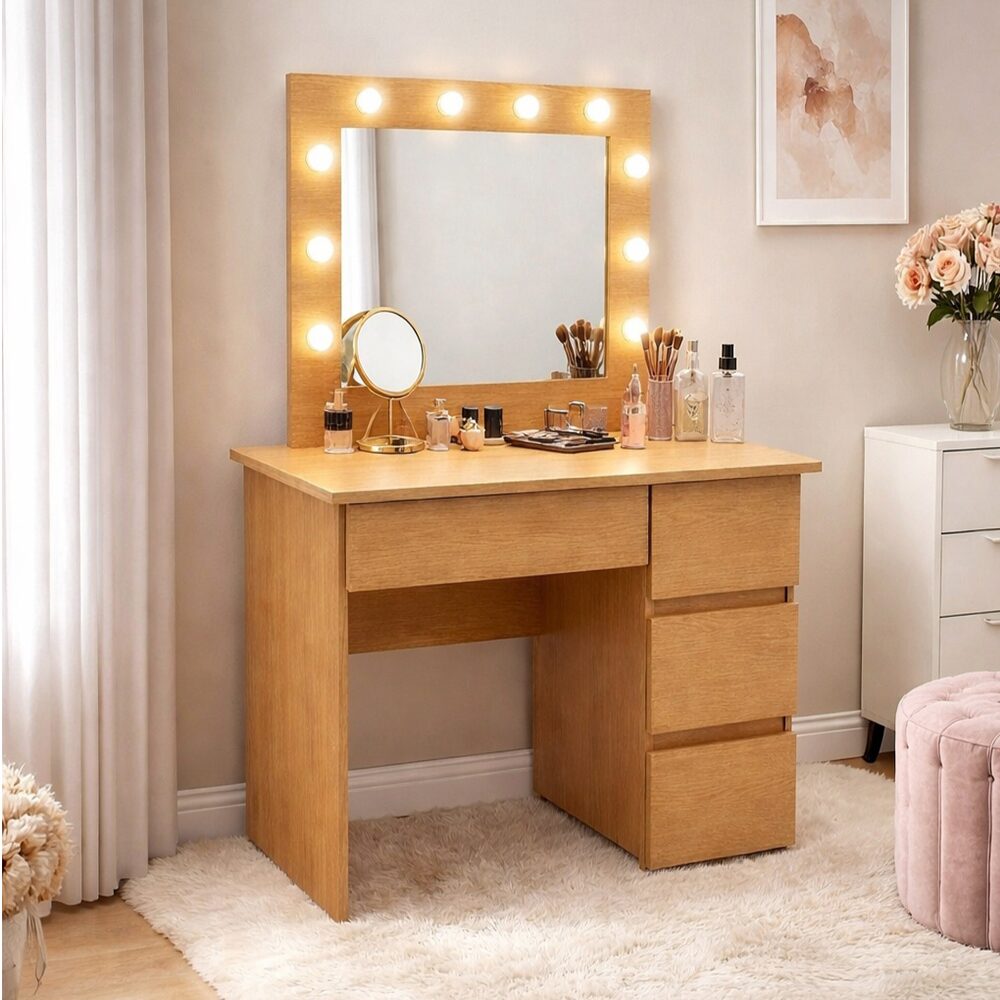 Design modern si finisaj Stejar: Cu un aspect natural si elegant, aceasta masa de machiaj se potriveste cu diverse stiluri de decor – de la minimalist la contemporan sau clasic modern.