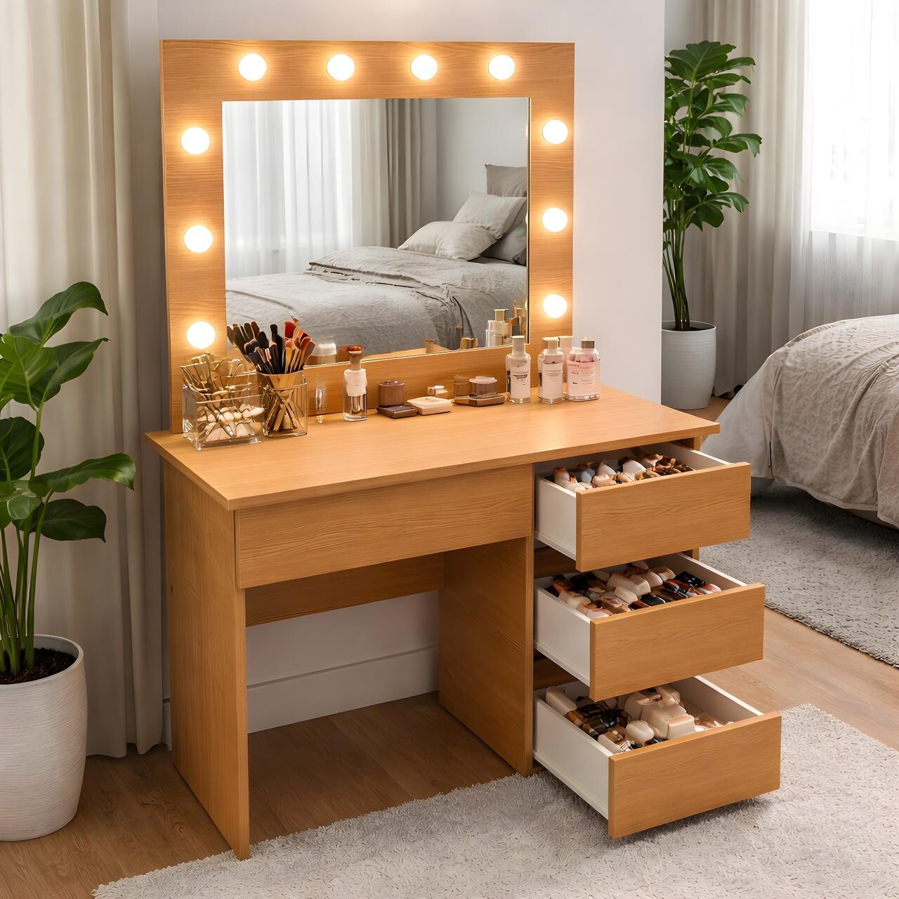 Design modern si finisaj Stejar: Cu un aspect natural si elegant, aceasta masa de machiaj se potriveste cu diverse stiluri de decor – de la minimalist la contemporan sau clasic modern.