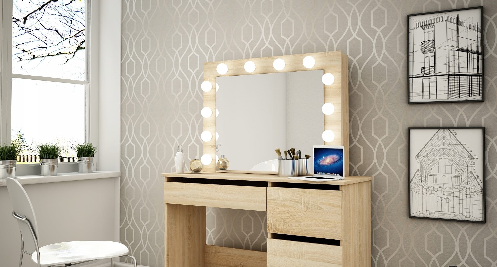 Masa de toaleta/machiaj + Scaun stil scandinav, Artool, stejar, cu oglinda si LED-uri, 94x43x141 cm