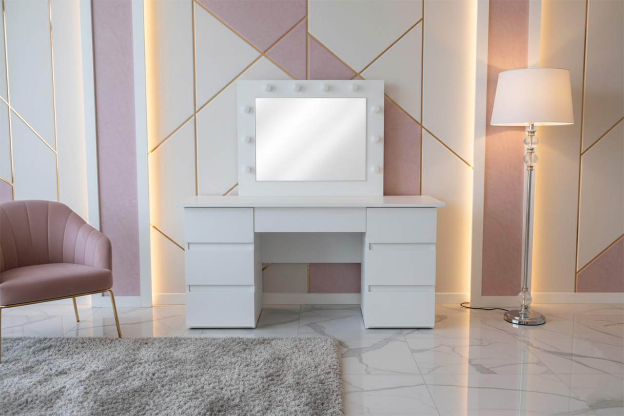 Oglinda mare incorporata in masa de toaleta/machiaj Vanessa ofera o imagine clara si detaliata, ceea ce faciliteaza aplicarea machiajului si coafurii. In plus, lumini LED sunt incorporate in jurul oglinzii pentru a oferi o lumina suficienta pentru a vedea detaliile de care ai nevoie in timp ce te machiezi sau te coafezi. Ele ofera posibilitatea de reglare a temperaturii de culoare. Veti putea, astfel, sa alegeti tipul de lumina care vi se potriveste cel mai bine (calda, rece sau neutra).