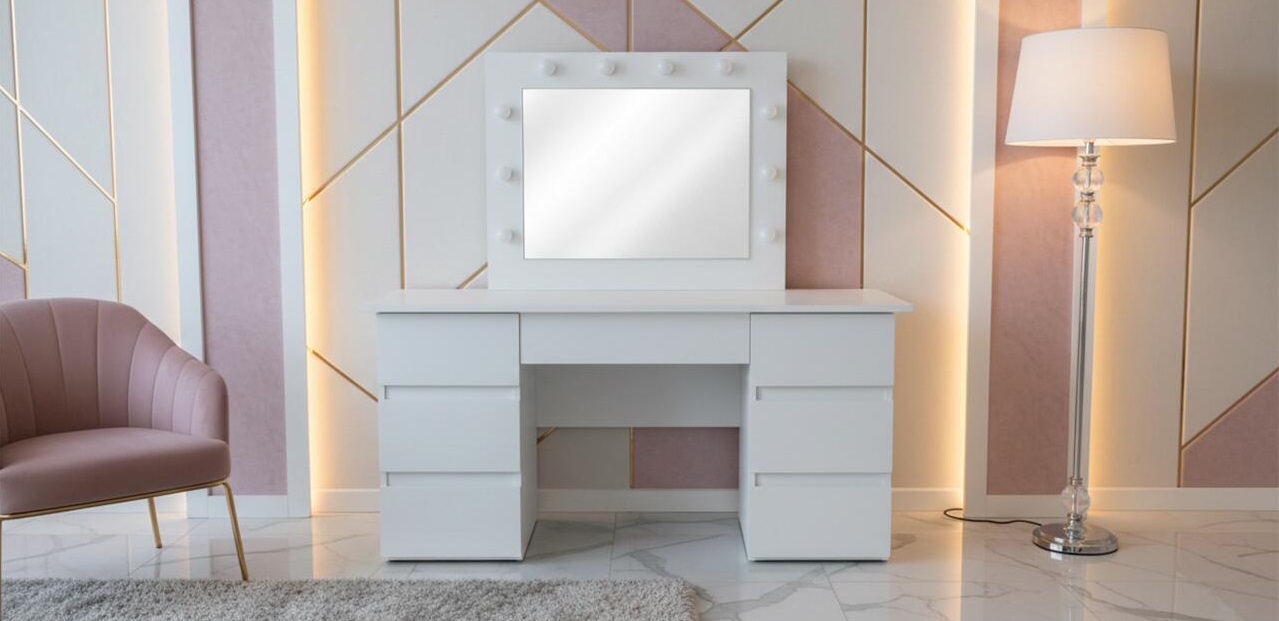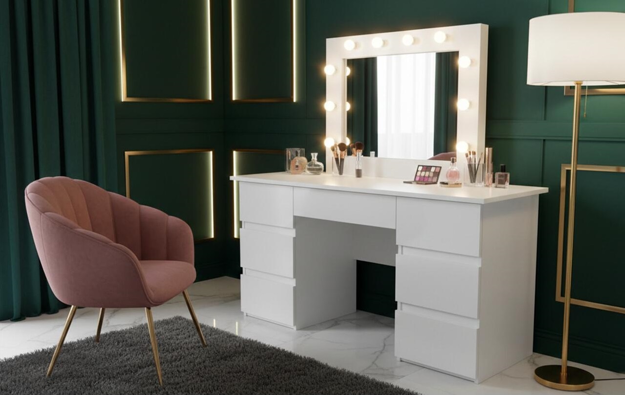 Masa de toaleta/machiaj, Vanessa + taburet, alb, cu oglinda si LED-uri, 130x43x143 cm