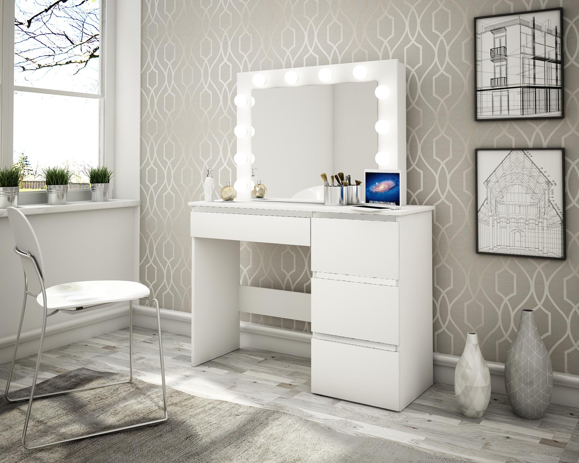 Masa de toaleta alba pentru machiaj cu oglinda si 12 leduri este cu siguranta visul oricarei femei.