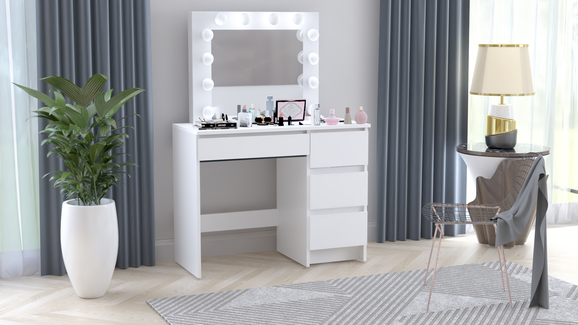 - Este dotata cu 3 sertare mici in partea dreapta si unul mai mare sub oglinda. Ele sunt vedetele acestui ansamblu, fiind decorate cu fronturi lucioase ce aduc un farmec aparte. Acestea ofera un spatiu generos in care va puteti depozita intreg setul de accesorii pentru machiaj sau igiena care trebuie sa fie mereu la indemana.