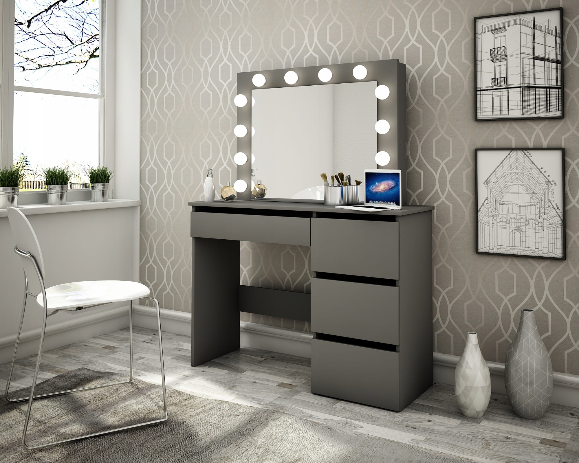 Masa de toaleta cu design contemporan constituie o modalitate superba de a-ti incepe ziua cu clasa si stil.