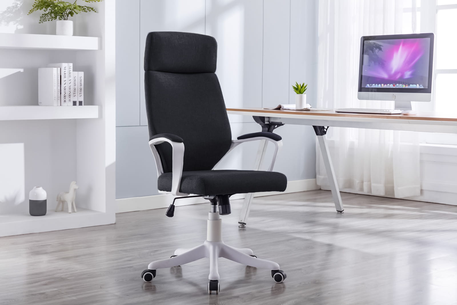 Scaun de birou, Jumi, rotativ, functie tilt, textil, negru si alb, max 120 kg, 64x65x111/120 cm