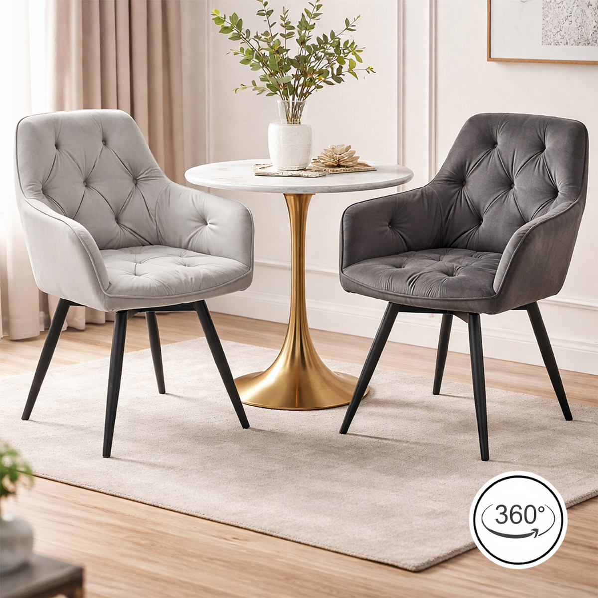 Scaun stil fotoliu bucatarie/living, Artool, York, rotativ, catifea, metal, gri argintiu si negru, 56x61x84 cm