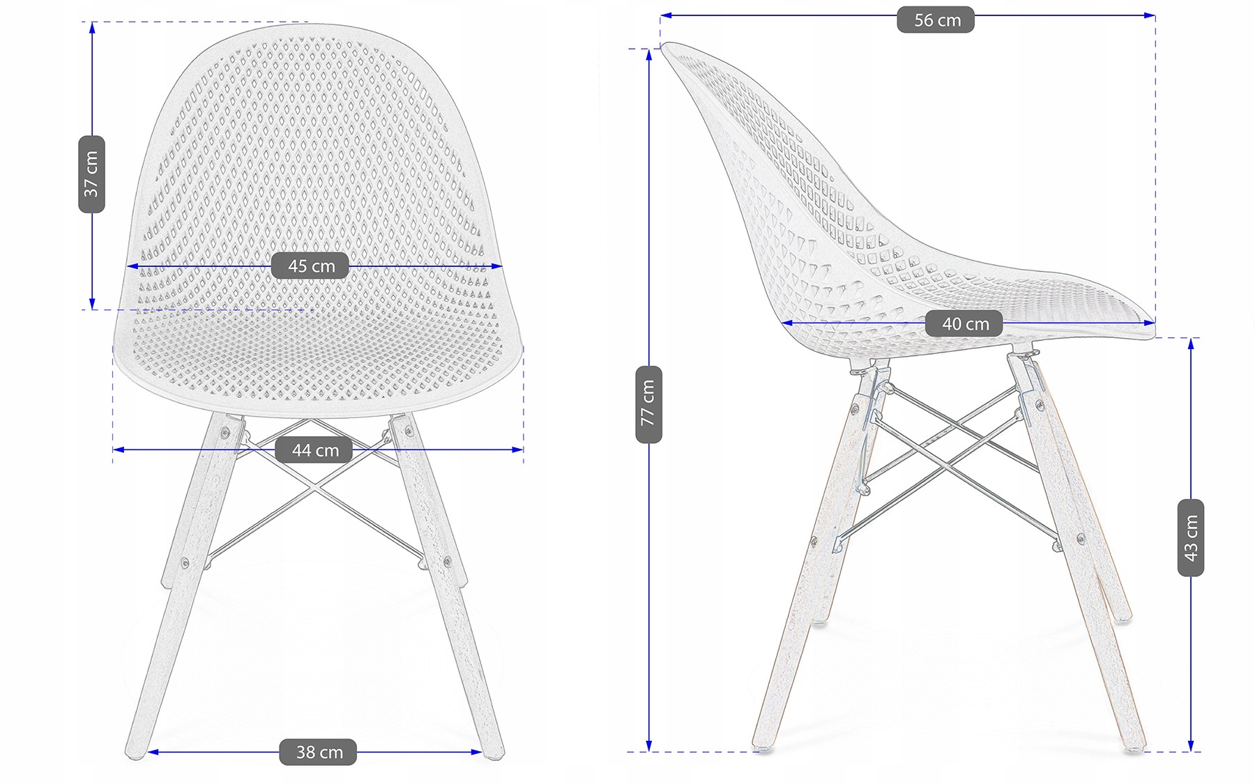 Sezutul si spatarul seamana cu o plasa tridimensionala, datorita careia scaunul pare extrem de usor si modern. Picioarele sunt realizate din lemn masiv de fag natural care asigura durabilitate si stabilitate in timpul utilizarii, iar rosturile negre intaresc intregul cadru si sunt totodata un decor.