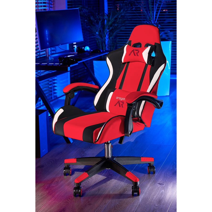 Scaun de gaming, Aragon, cu perna lombara, functie tilt, rosu, alb si negru, 61x59x114-125 cm