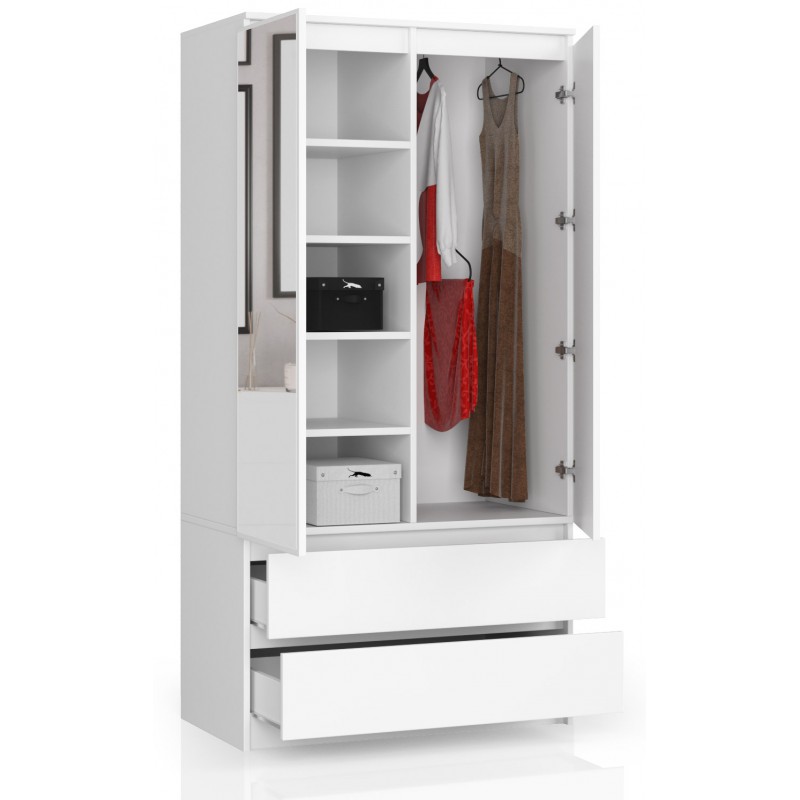 Dulap, placa laminata, 2 sertare, 5 rafturi, 1 suport umerase, 2 usi cu oglinda, alb, 90x51x180 cm