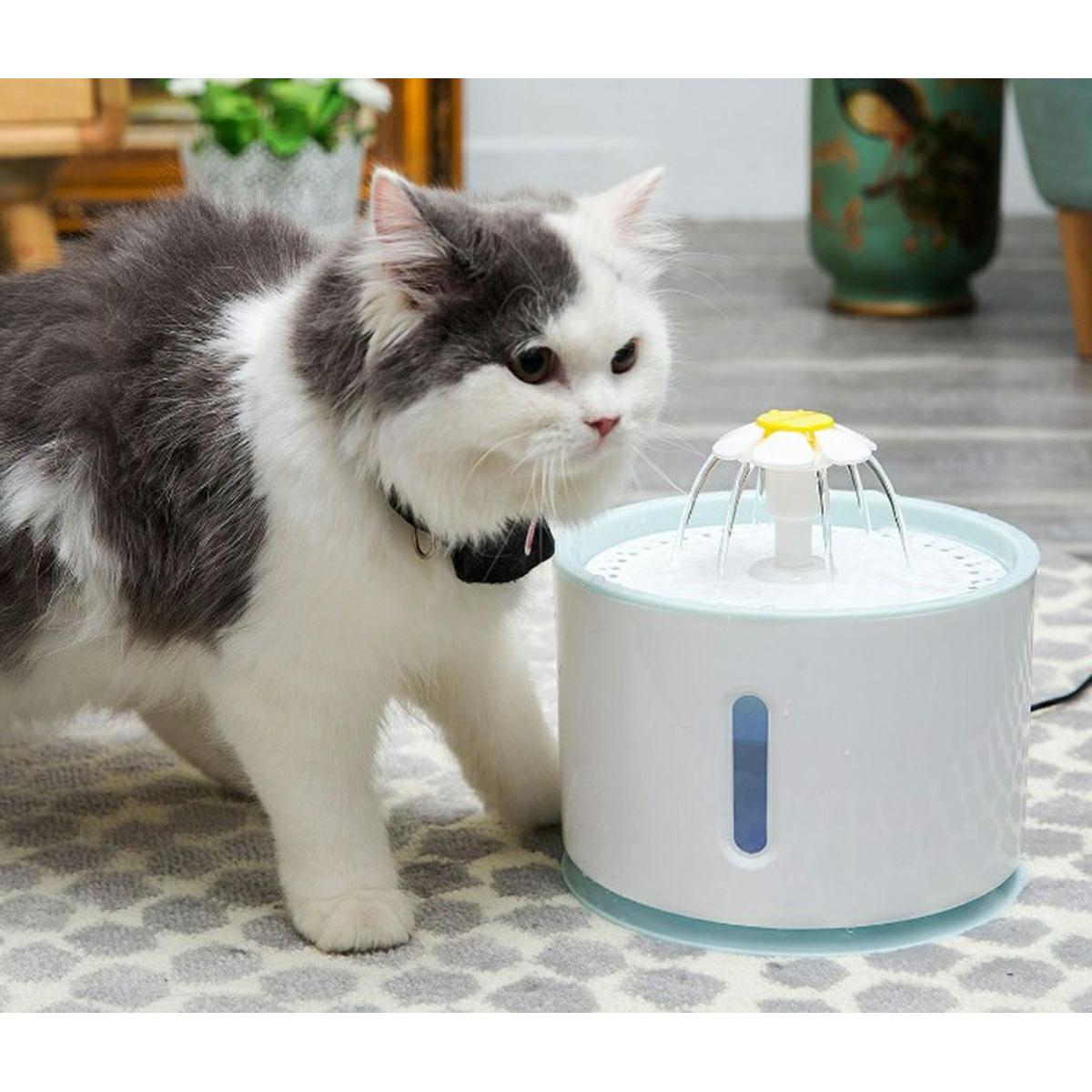 Adăpator automat pentru animale de companie. Design atractiv în formă de fântână cu mai multe duze. Un rezervor mare de apă cu o capacitate de până la 2,4 litri asigură o utilizare pe termen lung. Sistemul de filtrare (cu un filtru înlocuibil) oferă apă proaspătă și curată pentru animalul nostru de companie. Adapatorul este dotat cu o pompa silentioasa si eficienta, aparatul putand functiona cu succes noaptea. Aparatul are trei moduri de funcționare diferite (debitul de apă). Siguranța de utilizare este sporită de funcțiile de oprire automată și semnalizare apă scăzută (cu iluminare de fundal LED).